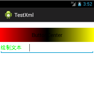 1 <LinearLayout xmlns:android="http://schemas.android.com/apk/res/android" 2 xmlns:tools="http://schemas.android.com/tools" 3 android:id="@+id/LinearLayout1" 4 android:layout_width="match_parent" 5 android:layout_height="match_parent" 6 android:orientation="vertical" 7 tools:context=".MainActivity" > 8 9 <Button 10 android:id="@+id/btncenter" 11 android:layout_width="fill_parent" 12 android:layout_height="wrap_content" 13 android:layout_marginTop="20dp" 14 android:text="@string/btncenter" /> 15 16 <!-- 將EditText進行重繪時要對其進行自定義,這樣在MainActivity中無需進行調用,他會自己調用 --> 17 18 <com.example.testxml.DrawEdit 19 android:layout_width="match_parent" 20 android:layout_height="wrap_content" 21 android:paddingLeft="100dp" 22 /> 23 24 25 </LinearLayout>