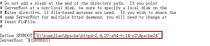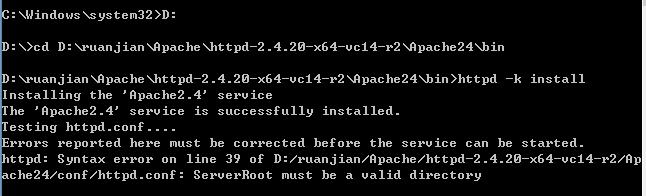 4.問題一個接一個,你重新輸入命令行httpd -k install,出現如下報錯,這是由於程序默認路徑和程序實際安裝路徑不一致導致的。這個解決方案是,找到Apache安裝程序目錄下的conf文件,找到httpd.conf用記事本打開,搜索"Define SRVROOT",找到需要改動的位置,Define SRVROOT引號裡面改成自己程序路徑就可以了。