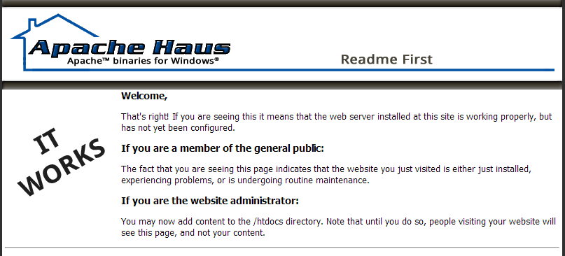 5.終於看到曙光了,這樣基本所有可能遇到的問題都解決了。接下來我們會看到安裝成功了。輸入命令行net start Apache2.4啟動服務,測試安裝情況,出現如下情況則是安裝正確。同時可以輸入http://localhost/進行驗證,出現如下頁面。
