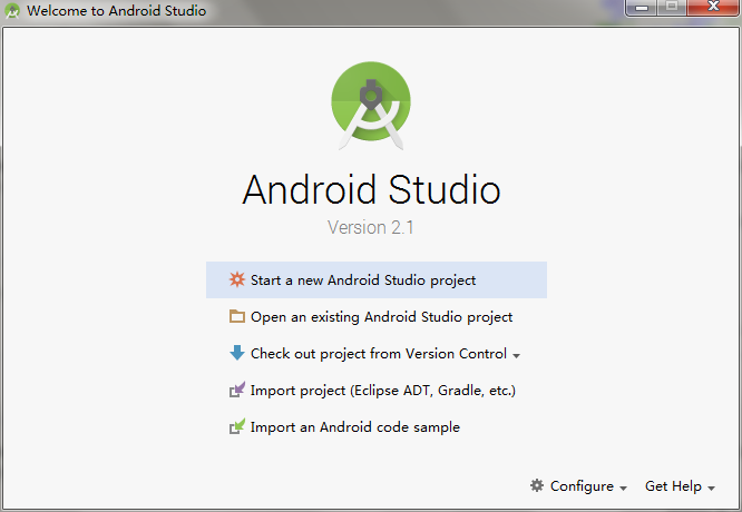 看到新建一個Android工程的選項了嗎?到此你已經成功搭建了Android Studio的環境,大功告成。