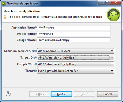 Package Name:應用程序包的命名空間(遵循Java中相同的規則)。包的名稱必須是唯一的,建議使用與組織的反向域名開頭的名稱。在這個項目中,可以使用