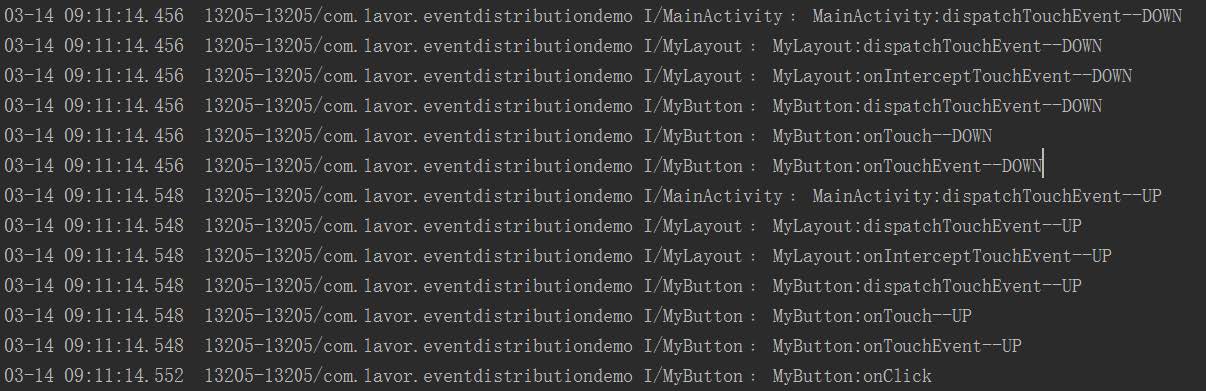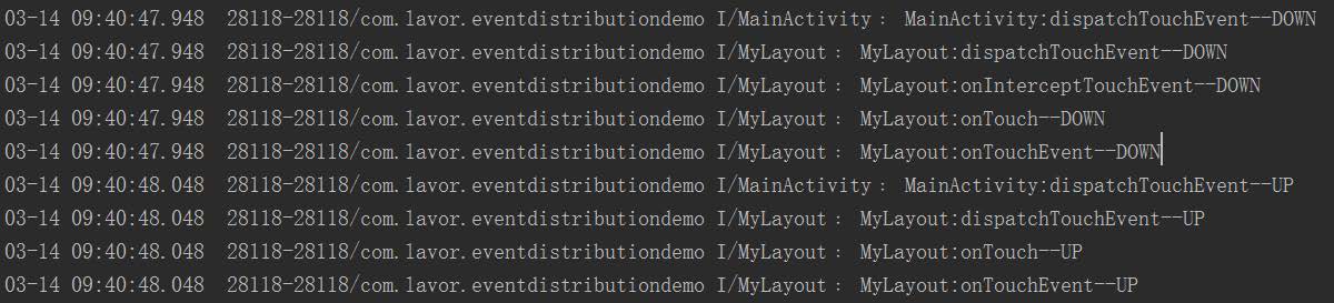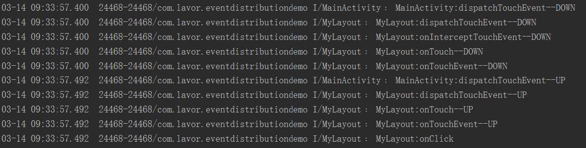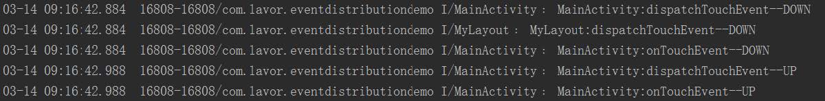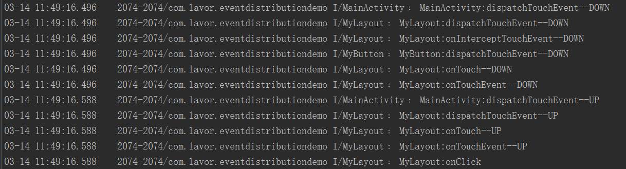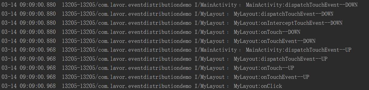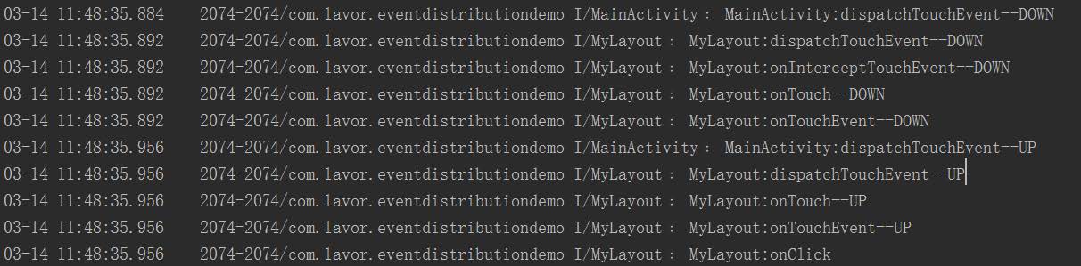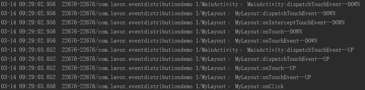 但是這兩個結果還有一個不對應的地方,那就是第一個結果的MyLayout的onInterceptTouchEvent方法在抬起時沒有執行,而第二個結果執行了。這是因為ViewGroup中的dispatchTouchEvent方法只會在按下時或者該事件會繼續往下分發時才會調用onInterceptTouchEvent方法。