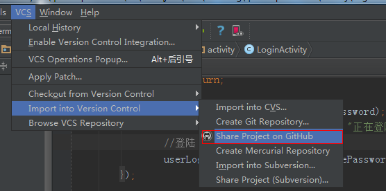 4. 分享項目: VCS -> Import into Version Control -> Share Project on GitHub, 點擊之後開始設置 repository name(如果你有設置過MasterPassword 會彈出對話框讓填入密碼.)