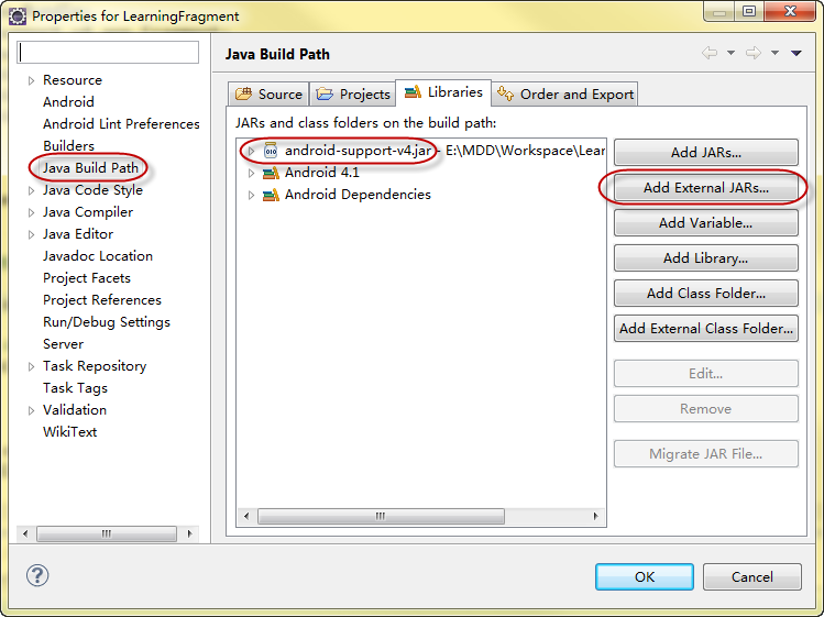 同時應該將上述的包拷入libs項目下的libs文件夾,然後在項目的Properties中添加:右鍵單擊項目,選Properties,左邊選 Java Build Path,然後Add External JARs…,添加android-support-v4.jar.