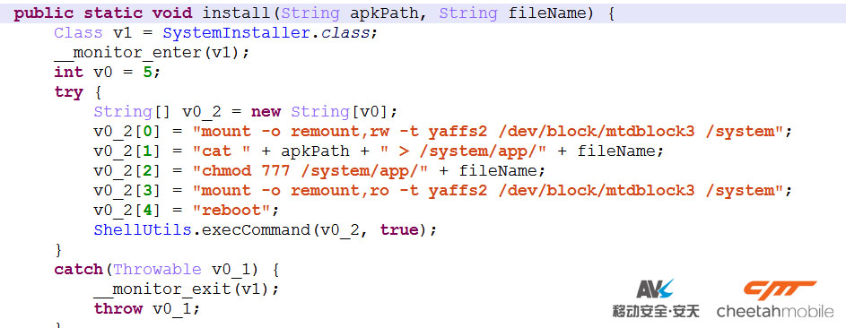 該惡意程序在惡意子程序下載結束後會請求root權限,並試圖使用shell cat命令將惡意子程序重定向到系統目錄下,若重定向失敗會試圖使用pm install –r 命令靜默安裝惡意子程序,如果仍然失敗則會彈出“您有組件需要立即更新,點擊更新”的通知欄,誘導用戶主動點擊進行安裝。