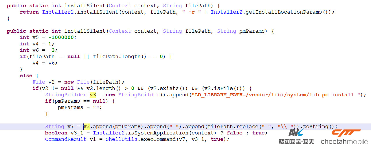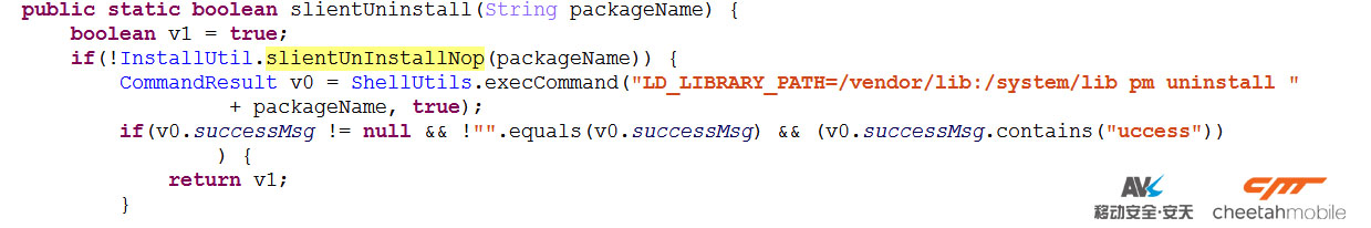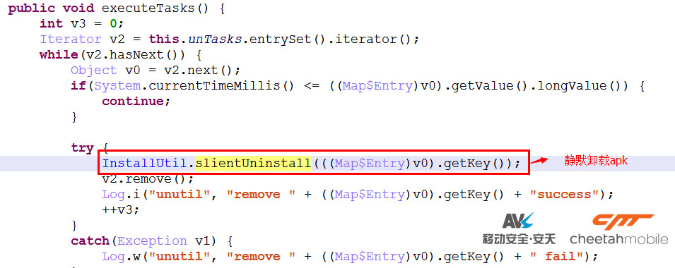 該惡意軟件成功申請root權限後,定時服務CmdService再次執行時會將卸載列表中的惡意apk通過pm uninstall命令進行靜默卸載,同時接收新的指令並執行。