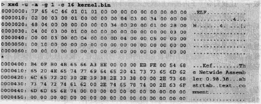 也就是說,我們應該把文件從開頭開始40Dh字節的內容放到內存30000h處。由於程序的入口在30400h處,所以從這裡就可以看出,實際上代碼只有0Dh+1個字節。下面是Kernel.bin的內容:
