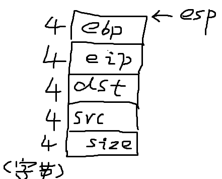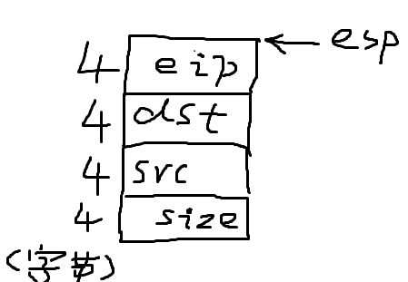 調用call指令的時候會自動把eip壓入棧中,MemCpy第一句把ebp壓棧,所以現在棧內情況如下圖: