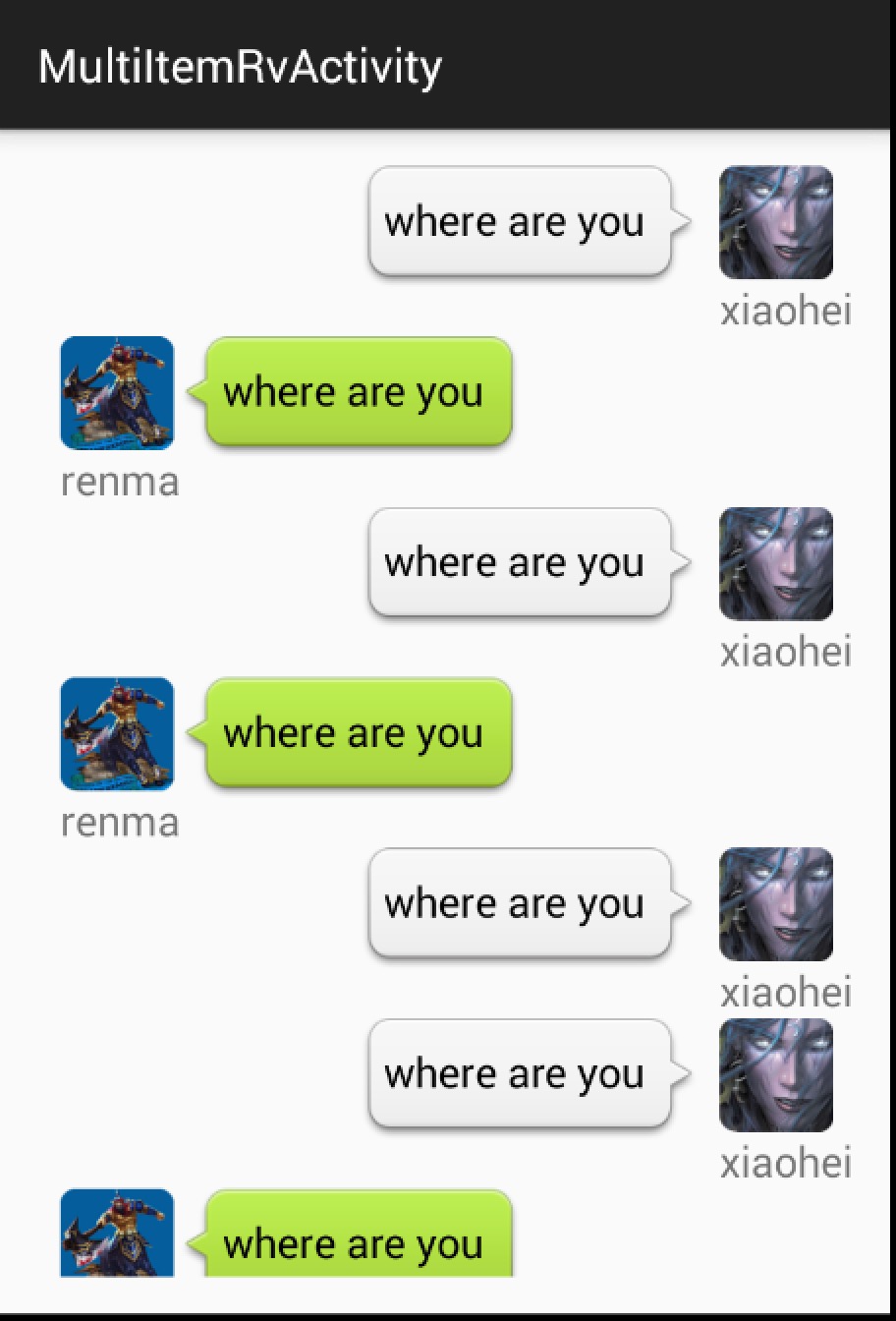1 2 3 4 5 6 7 8 9 10 11 12 13 14 MultiItemTypeSupport multiItemSupport = new MultiItemTypeSupport() { @Override public int getLayoutId(int itemType) { //根據itemType返回item布局文件id } @Override public int getItemViewType(int postion, ChatMessage msg) { //根據當前的bean返回item type } }剩下就簡單了,將其作為參數傳入到MultiItemCommonAdapter即可。