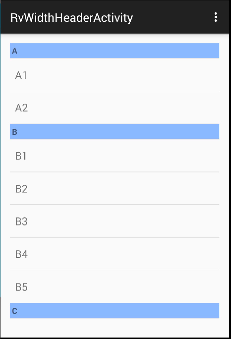 1 2 3 4 5 6 7 8 mRecyclerView.setAdapter(new SectionAdapter(this, mDatas, multiItemSupport) { @Override public void convert(ViewHolder holder, String s) { holder.setText(R.id.id_item_list_title, s); } });貼個效果圖: