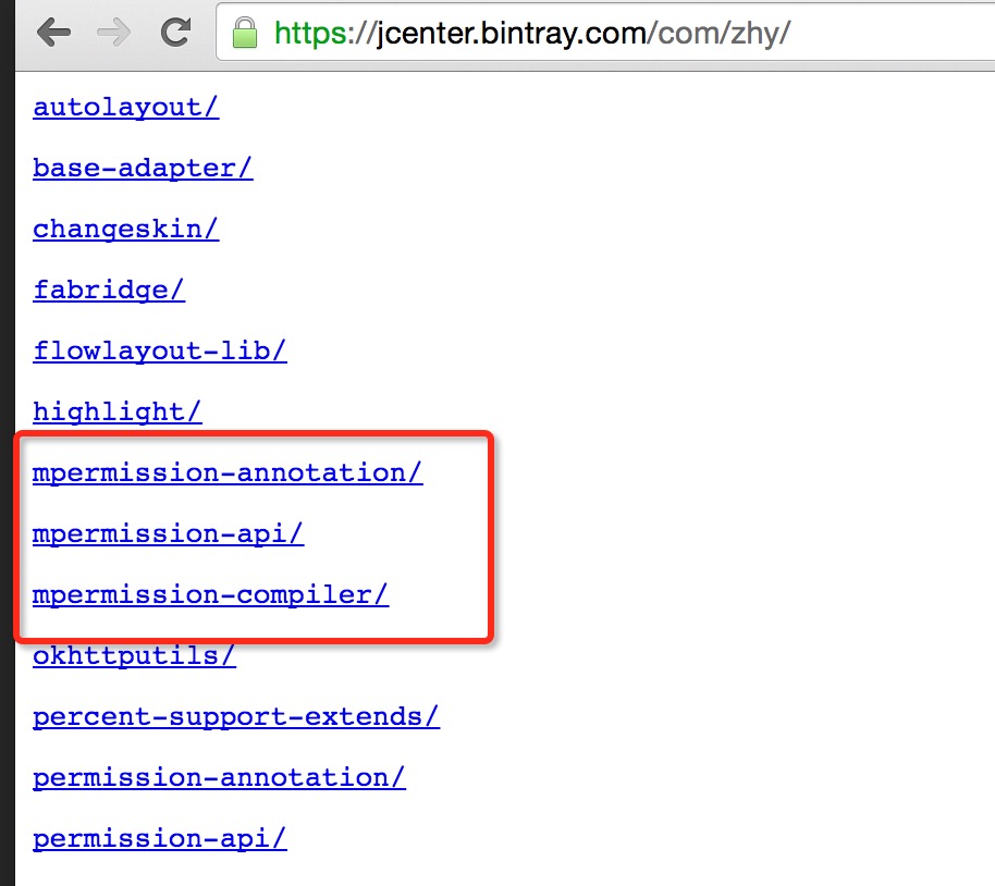 如果審核成功,你會發現3個module都會被同步到jcenter上,比如訪問http://jcenter.bintray.com/com/zhy/: