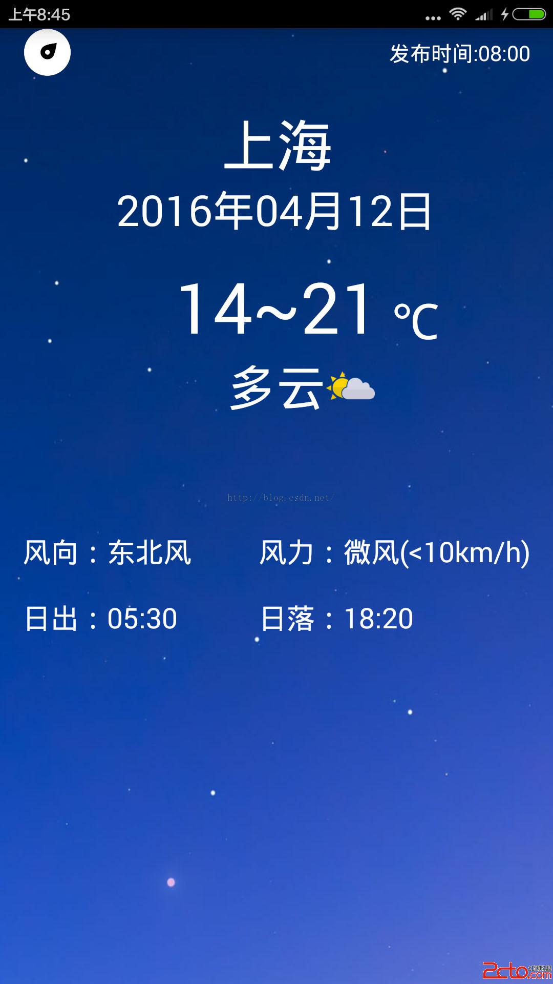 《第一行代碼》最後有一個天氣APP的示例教程,也是跟著敲了一遍,理解後根據自己需要修改了一些重新敲了一個app,由於中國天氣網的api接口不能用了,就改用了百度天氣的api接口,發現其中的城市代號是一致的,就使用了訪問中國天氣網的城市列表得到的城市代號再去訪問百度天氣api接口得到天氣情況,測試圖如下: