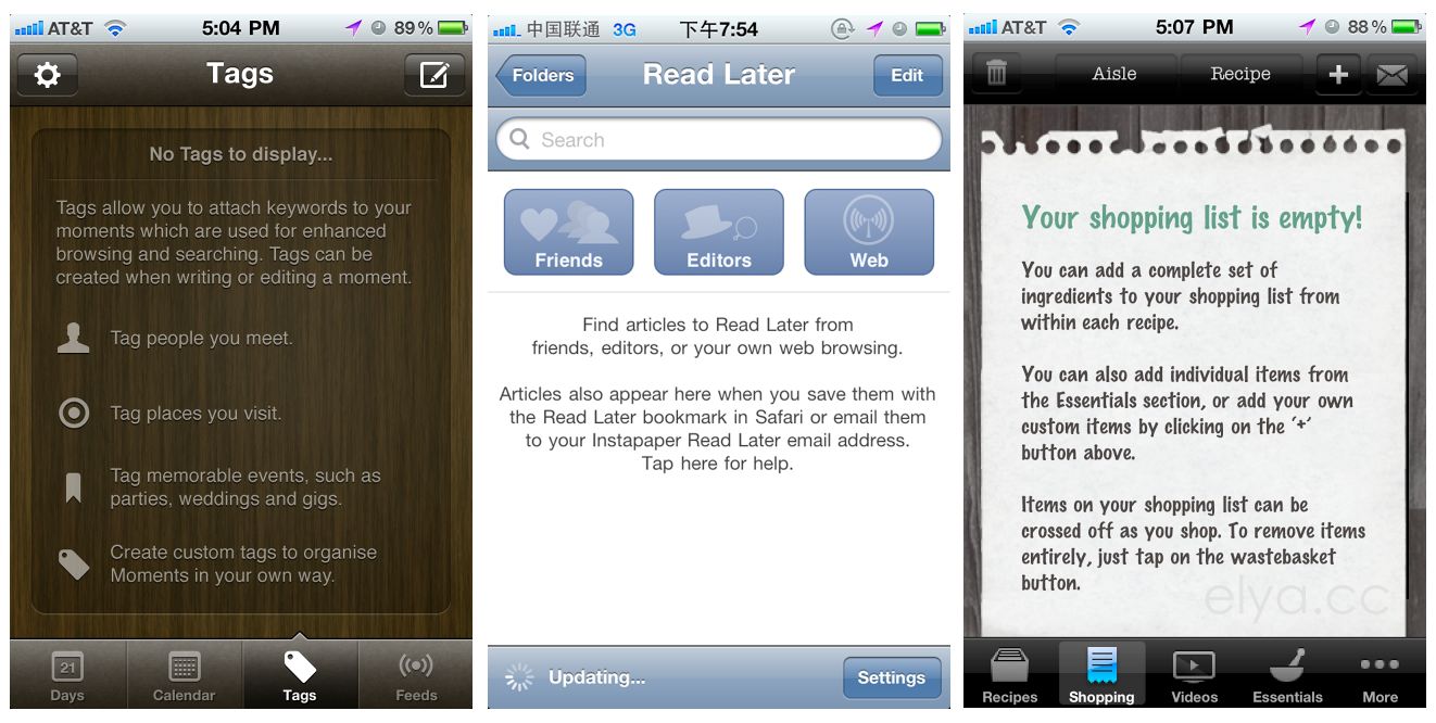 Menento是一個日記程序,當你沒有給日記增加tag的時候,這裡就會有文字說明,告訴你tag是用來浏覽和搜索的,可以在創建和編輯日記的時 候創建。告訴你可以把好友加為tag,可以把地理位置加為tag,可以把事件加為tag,可以創建自定義tag;Instapaper是一個閱讀工具,當 你首次打開應用,沒有文章的時候,這個頁面會有文字說明,告訴你你可以通過朋友、作者、浏覽器找到可閱讀的文章。當你通過浏覽器書簽或者Email發送的 方式增加文章到Instapaper後,文章會顯示在這裡;Jamie Oliver是一個美食工具,如果你沒有創建美食購物清單的時候,這個頁面會文字提醒你改如何增加Shopping list。