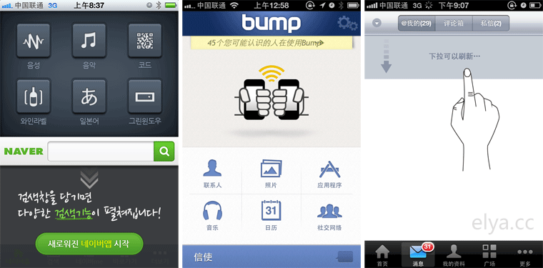 上圖從左到右依次是Naver、Bump和新浪微博。