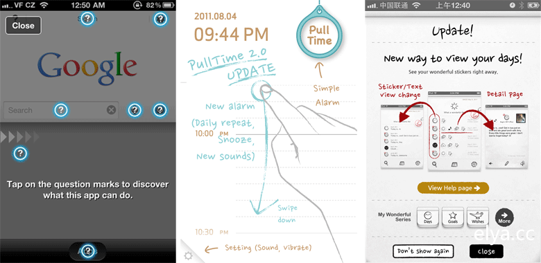 Google會在一頁內給出多個問號,點擊問號查看該區域所承載的操作及執行方法;Pull Time用更直觀的方法來表示這款交互出類拔萃的產品到底該怎樣使用;而Today則用一頁圖配文的說明來告知本版本更新了哪些內容。