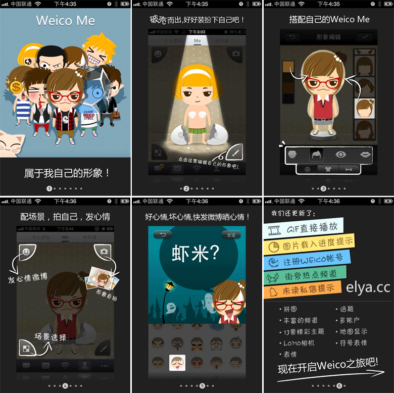 Weico的這次改版所采用的新手引導方式,絕對是稱得上讓人驚艷級別的,用了6頁,詳細的介紹了虛擬形象功能,簡單的提到了微博曬心情、Gif直 接播放、圖片進度提醒等等次級功能。雖然從功能上來講,我並不一定認同虛擬形象,但是從引導上來講,實在是太有愛了,不愧是設計公司。