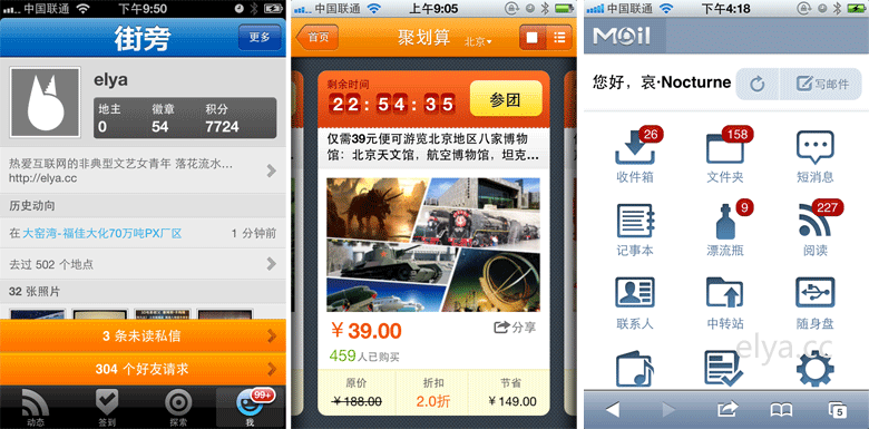從左到右依次是街旁、淘寶和QQ郵箱Wap版