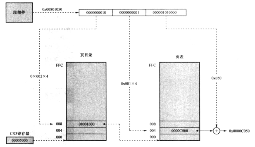 當前任務頁目錄的物理地址在處理器的CR3寄存器中,假設它的內容為0x00005000.段管理部件輸出的線性地址是0x00801050,其二進制的形式為0000 0000 1000 0000 0001 0000 0101 0000.高10位為0000000010,也就是十六進制的0x002,它是頁目錄表內的索引,處理器將它乘以4(因為每個目錄項為4字節),作為偏移量訪問頁目錄。最終,處理器從物理地址00005008處取得頁表的物理地址0x08001000.