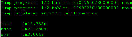 如上,明顯快了十秒,這還使用的是mysqlpump的默認線程數 2