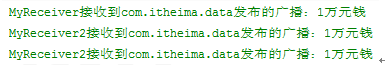 我們發現MyReceiver第一個接收到廣播,MyReceiver2第二個接收到廣播,然後MyReceiver2又接收到一次廣播。對的,結果確實是這樣,因為我們在sendOrderedBroadcast方法中,將MyReceiver2作為最終接收器,那麼我們發出的廣播會被所有符合條件的接收器接收,最後指定的最終接收器不管是否已經接收過信息依然會再次接收。