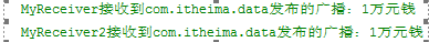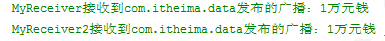雖然在MyReceiver中我們調用了abortBroadcast();方法,但是廣播依然被MyReceiver2接收到。原因是我們在sendOrderedBroadcast方法中指定了MyReceiver2接收器為最終接收器,因此該廣播被終止的時候MyReceiver2接收器依然可以接收到廣播。
