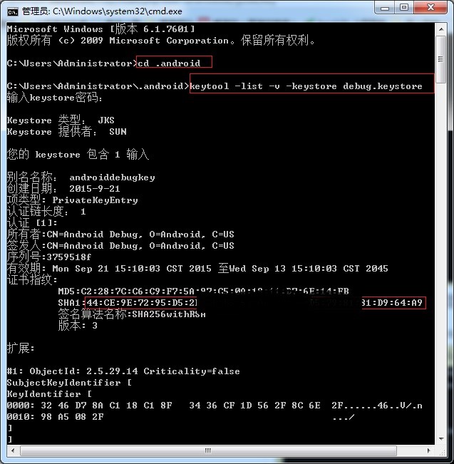 進入.android(參照下圖):輸入keytool -list -v -keystore debug.keystore ,密碼是 android