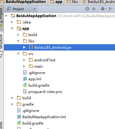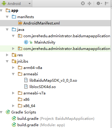 1、在工 程app/libs目錄下放入baidumapapi_vX_X_X.jar包,在src/main/目錄下新建jniLibs目錄,放入 libBaiduMapSDK_vX_X_X_X.so如下圖所示,注意jar和so的前3位版本號必須一致,並且保證使用一次下載的文件夾中的兩個文 件,不能不同功能組件的jar或so交叉使用。