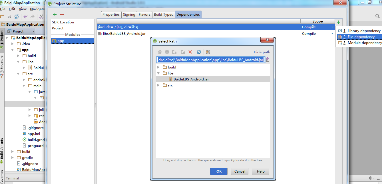 2、導入jar包。菜單欄選擇File->Project Structor->Modules->Dependencies,點擊+號,選擇File dependency,選擇jar包導入。
