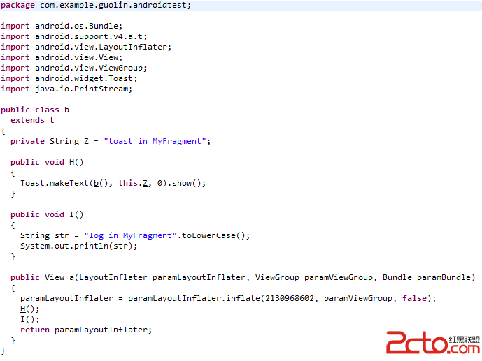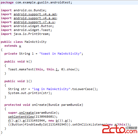 很明顯,這個是MainActivity中按鈕點擊事件的匿名類,在onClick()方法中的調用代碼雖然都被混淆了,但是調用順序是不會改變的,對照源代碼就可以看出哪一行是調用的什麼方法了。