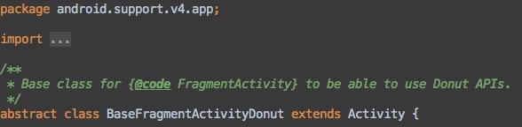 其中AppCompatActivity是在appcompat-v7包中的,它的父類FragmentActivity是在support-v4包中的,這兩個包我們都已經添加依賴了。但是FragmentActivity的父類就坑爹了,如果你去看BaseFragmentActivityHoneycomb和BaseFragmentActivityDonut這兩個類的源碼,你會發現它們都是在support-v4包中的: