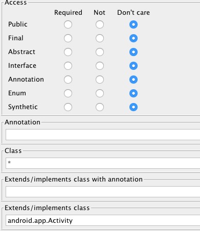通配符 描述 匹配類中的所有字段 匹配類中的所有方法 匹配類中的所有構造函數 * 匹配任意長度字符,但不含包名分隔符(.)。比如說我們的完整類名是com.example.test.MyActivity,使用com.*,或者com.exmaple.*都是無法匹配的,因為*無法匹配包名中的分隔符,正確的匹配方式是com.exmaple.*.*,或者com.exmaple.test.*,這些都是可以的。但如果你不寫任何其它內容,只有一個*,那就表示匹配所有的東西。 ** 匹配任意長度字符,並且包含包名分隔符(.)。比如proguard-android.txt中使用的-dontwarn android.support.**就可以匹配android.support包下的所有內容,包括任意長度的子包。 *** 匹配任意參數類型。比如void set*(***)就能匹配任意傳入的參數類型,*** get*()就能匹配任意返回值的類型。 … 匹配任意長度的任意類型參數。比如void test(…)就能匹配任意void test(String a)或者是void test(int a, String b)這些方法。