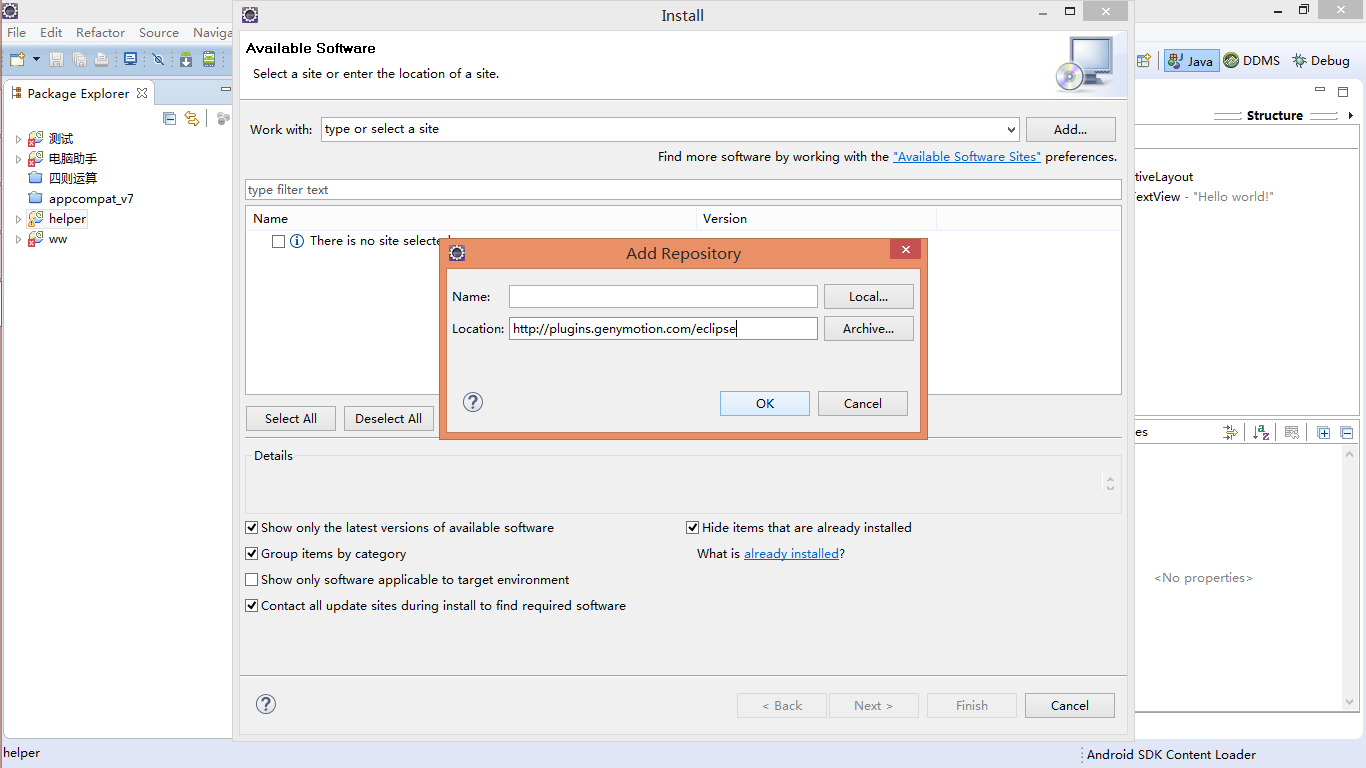 2.點擊Add,在locationhttp://plugins.genymotion.com/eclipse ,圖片下面有幾個條件試著勾選,Next高亮點擊: