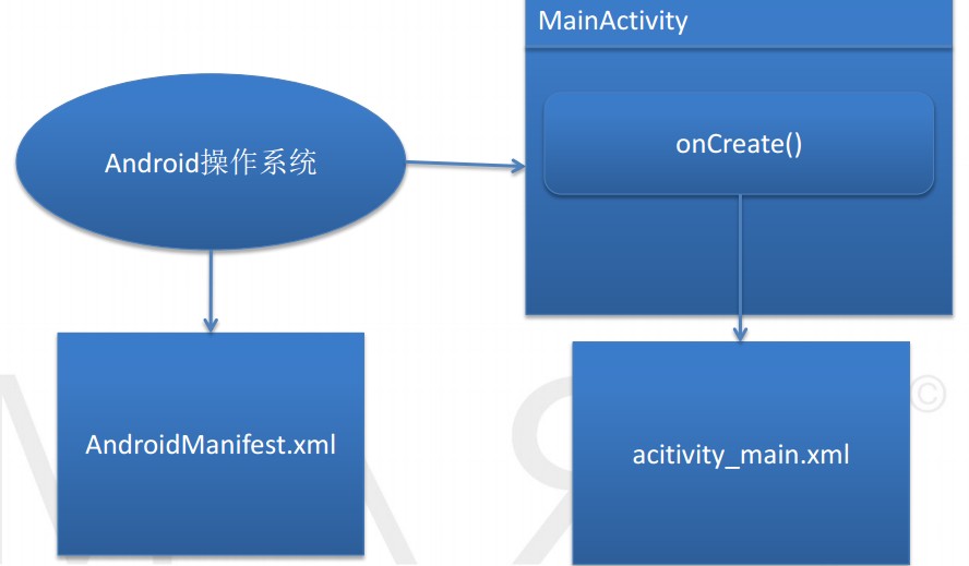 當運行我們的Android應用程序時,Android操作系統首先會去找我們的AndroidManifest.xml這個文件,這個文件是我們應用程序的主配置文件,因為我們一個應用可能有多個的Activity,那我們首先會展示哪個Activity呢?這個主配置文件就定義了當前這個應用默認所加載的那個Activity對象,找到這個Activity對象後,就會調用其onCreate()方法,這個方法主要就是用來加載我們的布局文件的,通過 setContentView()方法可以來加載我們指定的布局文件,最後根據布局文件中的各個控件顯示在我們的屏幕上。這個就是我們Activity的啟動流程。