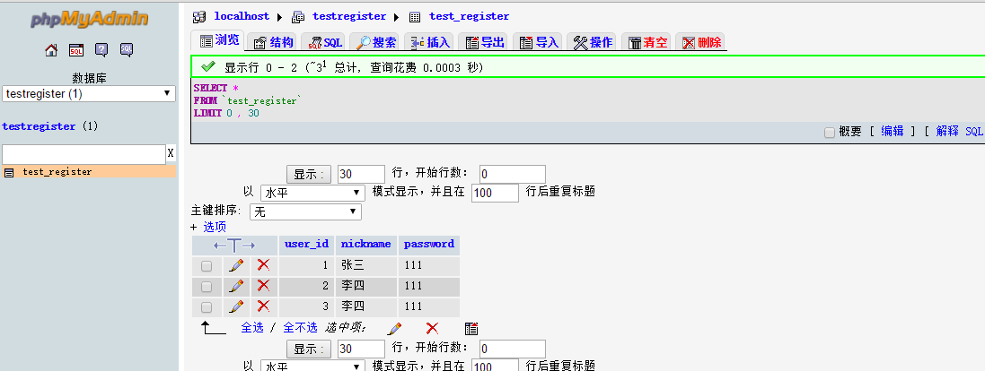 6 $result = mysql_query("SELECT nickname,password FROM test_register ORDER BY user_id DESC");