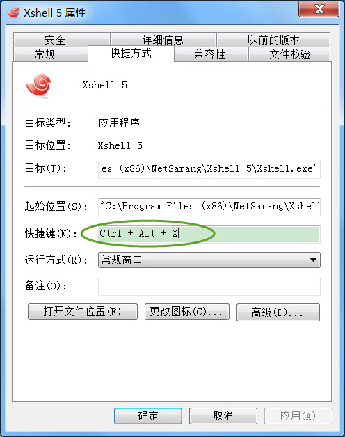 因Xshell很常用,故給它分配了一個快捷鍵,這樣可以很方便的隨時呼出。方法如下,點擊桌面Xshell圖標——右鍵——屬性——快捷方式——快捷鍵——Ctrl+Alt+X——確定,如下圖所示,同理Android Studio可以分配Ctrl+Alt+A。此方法適用於日常使用頻率較高的軟件,避免頻繁回到桌面或者從開始菜單點擊啟動,隨按隨到,方便高效。