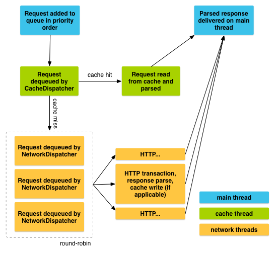 四、Volley是怎麼管理請求的呢? RequestQueue會維護一個緩存調度線程(cache線程)和一個網絡調度線程池(net線程)(注意,這是一池子線程),當一個Request被加到隊列中的時候,cache線程會把這個請求進行篩選:如果這個請求的內容可以在緩存中找到,cache線程會親自解析相應內容,並分發到主線程(UI)。如果緩存中沒有,這個request就會被加入到另一個NetworkQueue,所有真正准備進行網絡通信的request都在這裡,第一個可用的net線程會從NetworkQueue中拿出一個request扔向服務器。當響應數據到的時候,這個net線程會解析原始響應數據,寫入緩存,並把解析後的結果返回給主線程。如下圖: