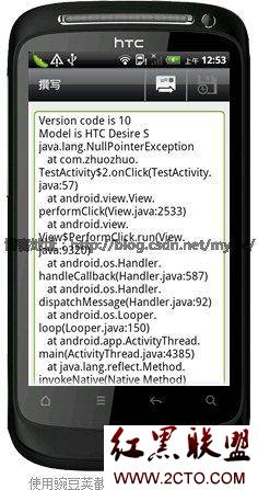 例子:點擊按鈕後,會觸發一個NullPointerException的運行時異常,這個例子實現了捕獲運行時異常,發送郵件反饋設備和堆棧信息的功能。