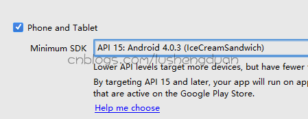 勾選“Phone and Tablet”,然後選擇SDK版本,這裡選擇“4.0.3”,目前搭載4.0以上版本的手機在90%以上,所以能兼容大多數設備了