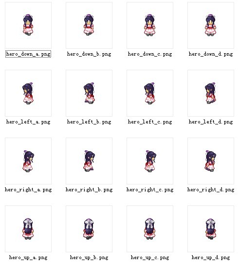 如圖所示上下左右方向每一組動畫中的每一幀都是一張png圖片,播放動畫須要切換整張圖片 ,實現動畫效果。代碼中只需要將下一幀圖片完整的覆蓋住上一幀的圖片就OK了,這種資源的排列方式在程序算法上是最簡單的。