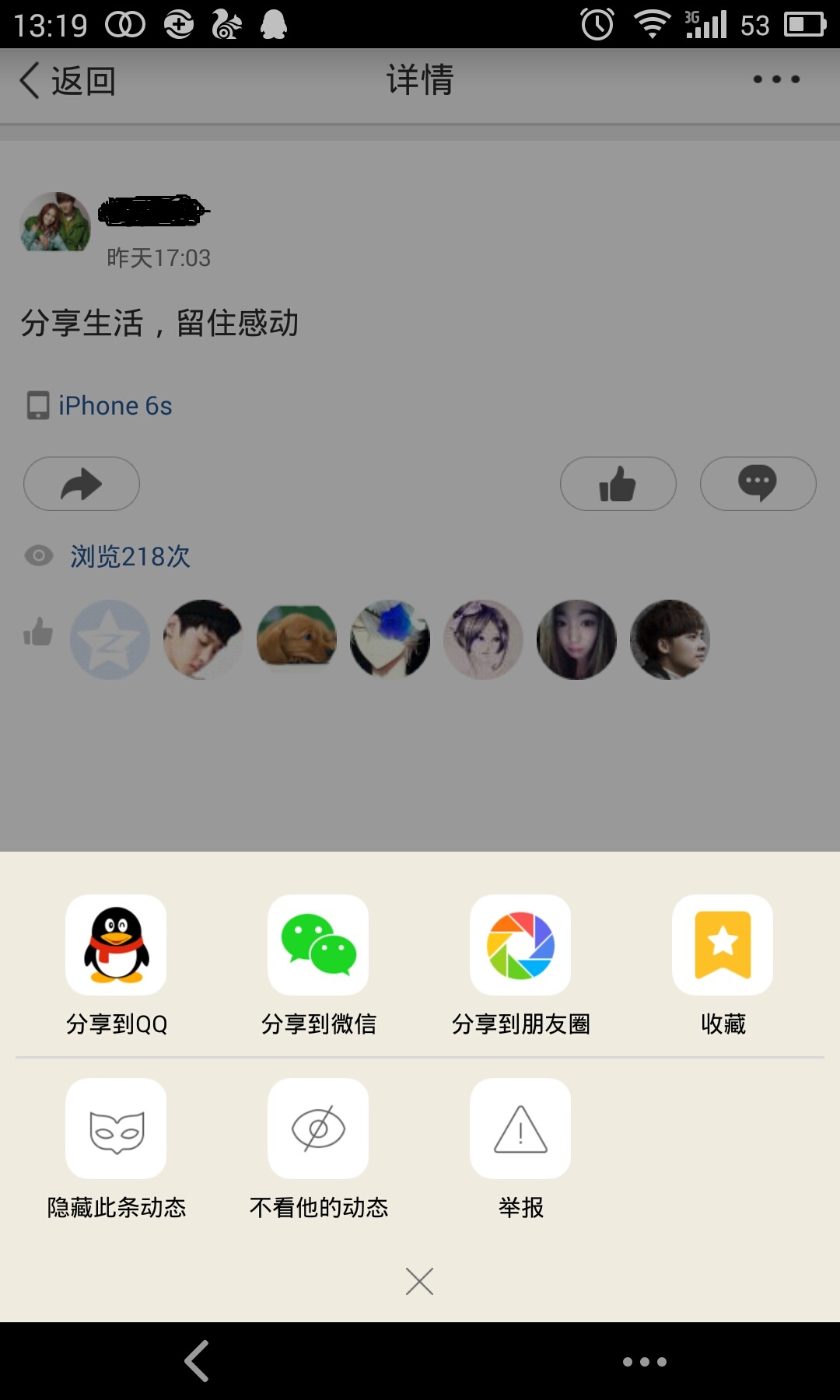 1、點擊右上角三個點的圖標,在界面底部彈出一個區域,這個區域有一些按鈕提供給我們操作 2、當該區域出現的時候,詳情界面便灰了,也說成透明度變化了 3、當任意選了一個按鈕或者點擊了該區域以外的部分,該區域消失,灰色界面變回亮白色,並執行點擊的按鈕對應的操作