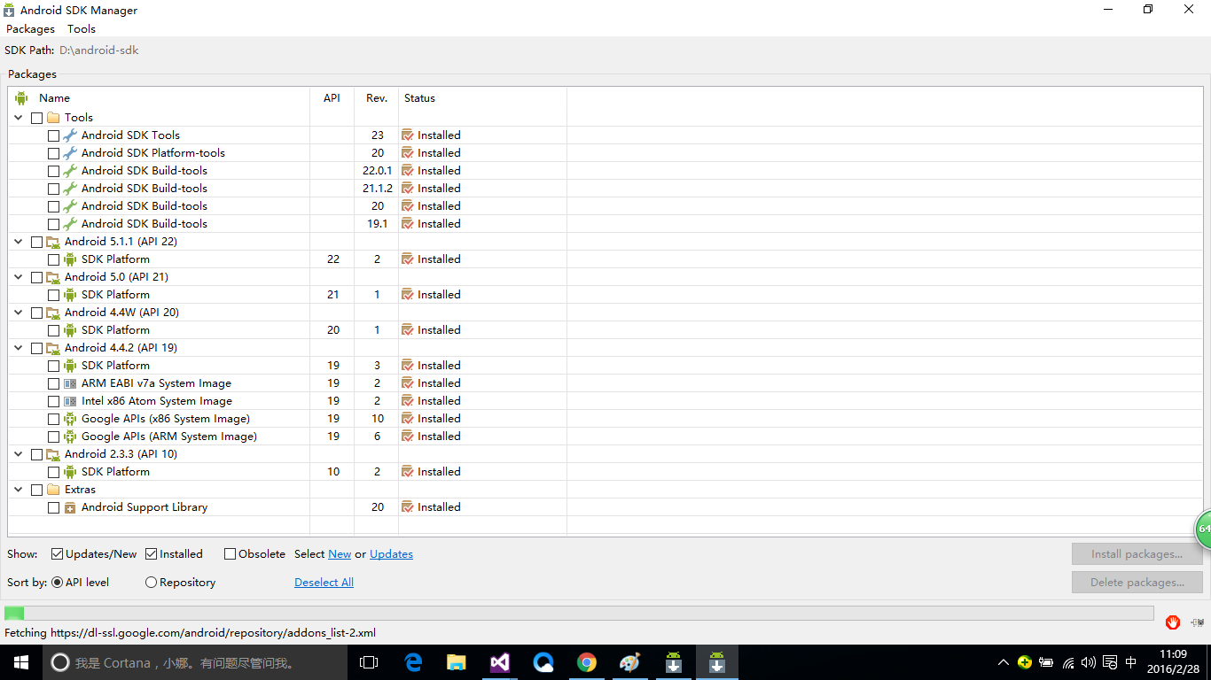 這樣的檢測結果讓我很郁悶,自己明明安裝了Node.JS了啊!並且是32位的。難道是安裝了最新版的(v5.7),無語啊!還有就是Android程序包,不很明白他說的到底是哪一個,反正已經安裝了很多,如下圖: