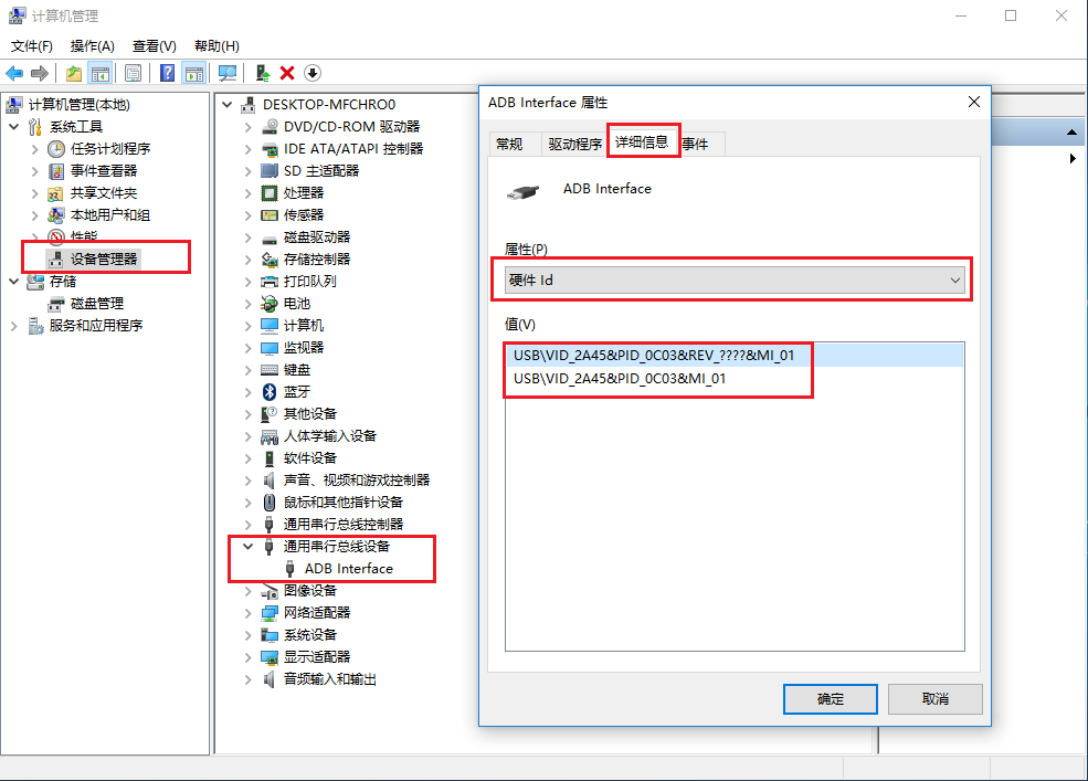 哎!瞧瞧人家,這麼老的手機都可以,就是系統有點老(2.3)、內存是有點小(256MB)……難道我的魅藍note2就不行,其實我找了一種間接的解決方案,就是電腦和手機都安裝360手機助手(我的同學說豌豆莢也可以),安裝之後就可以了,也部署成功了,但是卸載之後就不行了。最後我問了一下我搞Android開發的同學,他說應該是驅動的問題,這兩個驅動(?android驅動和?存儲驅動)應該是兩碼事兒,並給了我一篇文章:adb devices 找不到設備怎麼辦 當我看到“adb_usb.ini” 這幾個字的時候我眼前一亮,因為我看見過它。其實這篇經驗說的很清楚關鍵是找到“硬件ID”,按照他的說法先找到“ADB Interface” ,雙擊進入“ADB Interface 屬性”,接著選中“詳細信息”,最後在屬性下拉框中選中“硬件ID”,我的魅藍note2是 2a45,如下圖:
