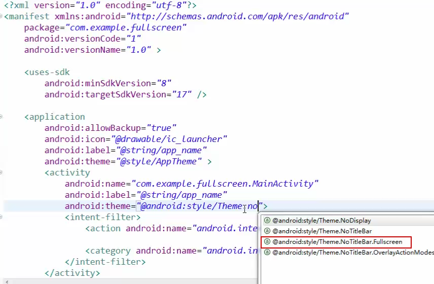 設置全屏的另一種方法:在AndroidManifest.xml文件中設置風格,