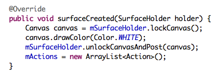 一、關於自己定義畫筆的顏色和粗細。這個最簡單,僅僅須調用Paint的setColor(int color)和setStrokeWidth(float width)這兩個方法就可以。須要基本的是,使用SurfaceView畫圖須要注意是通過SurfaceHolder獲得Canvas實例,這時能夠通過Canvas實例去畫圖,繪制結束調用unlockCanvasAndPost(canvas)去提交改變。