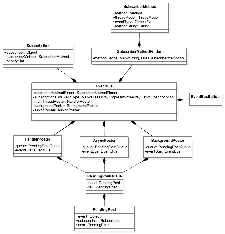 根據類來分析,從中,我們可以看到EventBus依賴有五個類,分別如下。