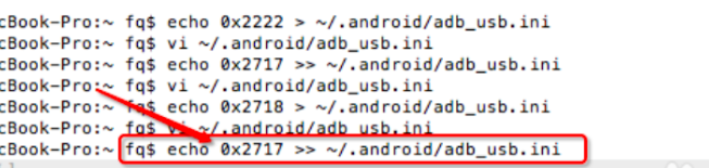 在mac終端下面輸入命令,echo 0x2717 >> ~/.android/adb_usb.ini 意思是把設備的廠家ID輸入到 adb_usb的初始配置文件中。