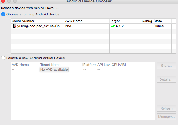 之後下了一個ADT Bundle,這個東西包含了Eclipse、ADT插件和SDK Tools,是已經集成好的IDE,只需安裝好Jdk即可開始開發。這個感覺是挺方便的,但是是不帶模擬器的。可以下載SDK System images,之後便可以使用模擬器了。但我弄了之後發現可以打開模擬器,但是模擬器跑不了程序,提示應用啟動失敗...查了一下應該是版本不兼容的問題。我也沒再糾結這個問題了,模擬器不行,咱就直接上真機調試吧,在真機上調試還比較直觀一點,而且啟動速度也不慢。