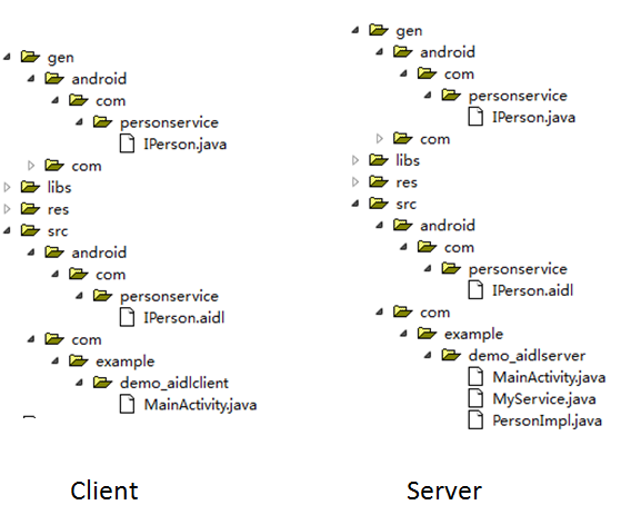 也是彼此獨立的,如果在一個應用中訪問另一個應用,也就是調用遠程服務,就要把服務端定義的AIDL文件放到客戶端,