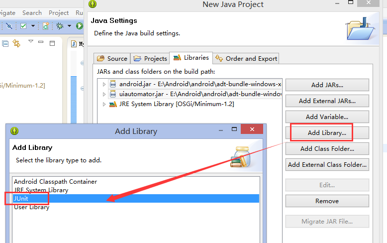 此外還需要再加入本地庫,點擊“Add Library”,選擇Junit,後點擊“next”,使用默認的JUit3。點擊“Finish”。